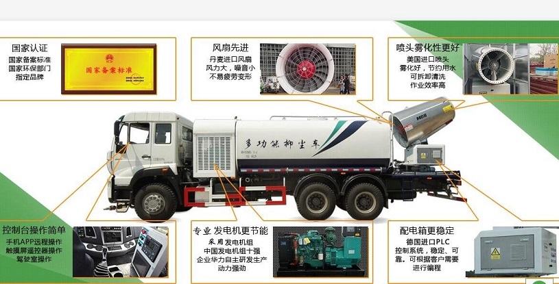 噴霧抑塵車隨車裝配大功率柴油機、三相交流同步發(fā)電機、三相異步電動機、三缸活塞泵,并安裝風機風炮,為農藥噴灑提供專一動力來源和專用設備。灑水泵可抽水排水,安裝濾網,帶消防接口,可通過消防栓進水,帶自流閥,隨車選裝20米噴藥綠化卷盤