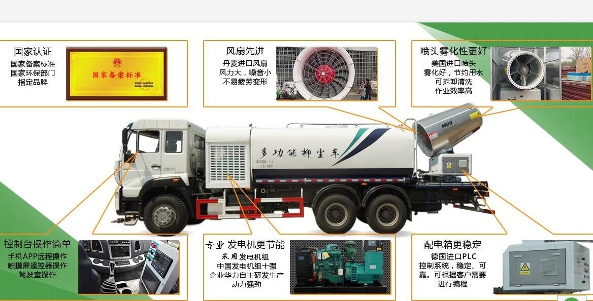 重汽8方多功能抑塵車,噴霧抑塵車又稱:多功能抑塵車、降塵車、霧炮車、空氣凈化車。主要是在灑水車的基礎上,增加了遠距離噴霧抑塵系統,對治理工業粉塵污染、汽車尾氣、秸稈燃燒等產生在空氣中的細小懸浮顆粒有顯著的效果,被人們成為“治霾神器”。多功能抑塵車主要作用是噴霧抑塵,同時具備灑水和道路沖洗功能,還可進行工地降塵、環保除塵、空氣凈化等作業。風送式噴霧大炮可達30-120米不等,霧炮筒可360°旋轉,可遙控操作。操控方便,移動靈活。