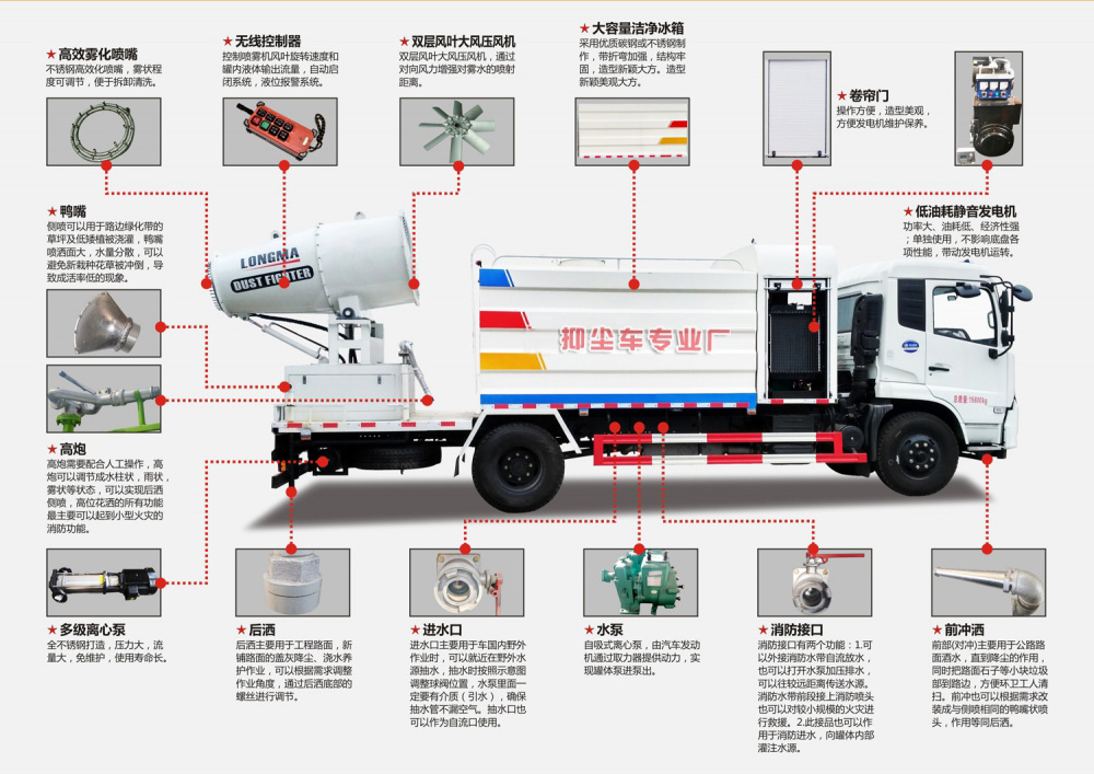 噴霧抑塵車隨車裝配大功率柴油機、三相交流同步發電機、三相異步電動機、三缸活塞泵,并安裝風機風炮,為農藥噴灑提供專一動力來源和專用設備。灑水泵可抽水排水,安裝濾網,帶消防接口,可通過消防栓進水,帶自流閥,隨車選裝20米噴藥綠化卷盤